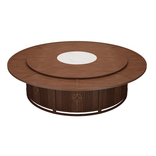 。這款宴會(huì)餐廳新中式實(shí)木20人轉(zhuǎn)盤電動(dòng)餐桌是由經(jīng)典的胡桃色實(shí)木與白色大理石搭配。轉(zhuǎn)盤是白色的大理石,桌面是胡桃色的實(shí)木,這樣看起來電動(dòng)餐桌上下更加呼應(yīng),底座采用很前衛(wèi)的豎行格柵,并且在桌面可以電動(dòng)遙控旋轉(zhuǎn),讓電動(dòng)餐桌功能更加豐富,就餐者有更好的就餐體驗(yàn)。
