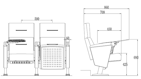 2.座椅基本中心距為590±1.0mm,座包打開側(cè)深708±1.0mm,座包深度450±1.0mm,基本椅高為1000±1.0mm。最小排距:900mm。