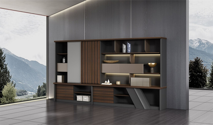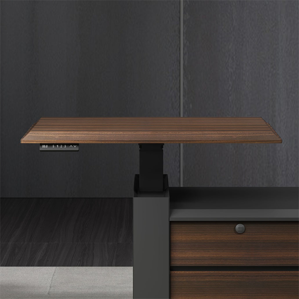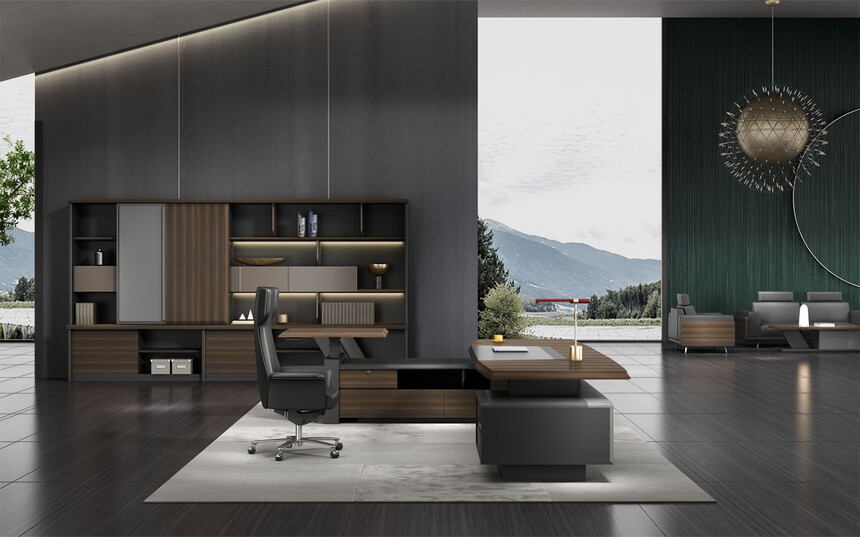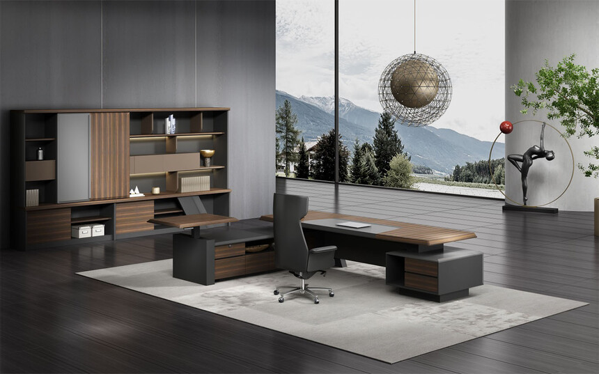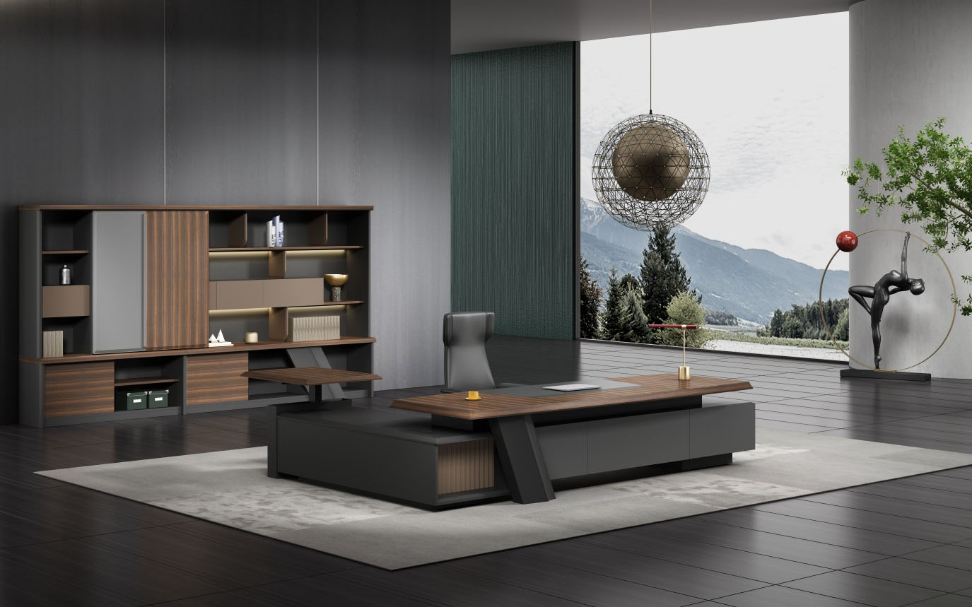 浩韻系列 深邃神秘,時尚富有魅力。態(tài)勢沉穩(wěn)又不失靈動,富有個性而不張揚。設(shè)計靈感源于建筑的傾斜式支撐給人帶來的沖擊感。不同材質(zhì)的相互碰撞,實木結(jié)合金屬嵌件,充滿現(xiàn)代氣息。在現(xiàn)有的辦公功能上結(jié)合隱藏的電動升降臺,將科技與美學(xué)完美結(jié)合,打造時尚簡潔的現(xiàn)代化辦公空間。
